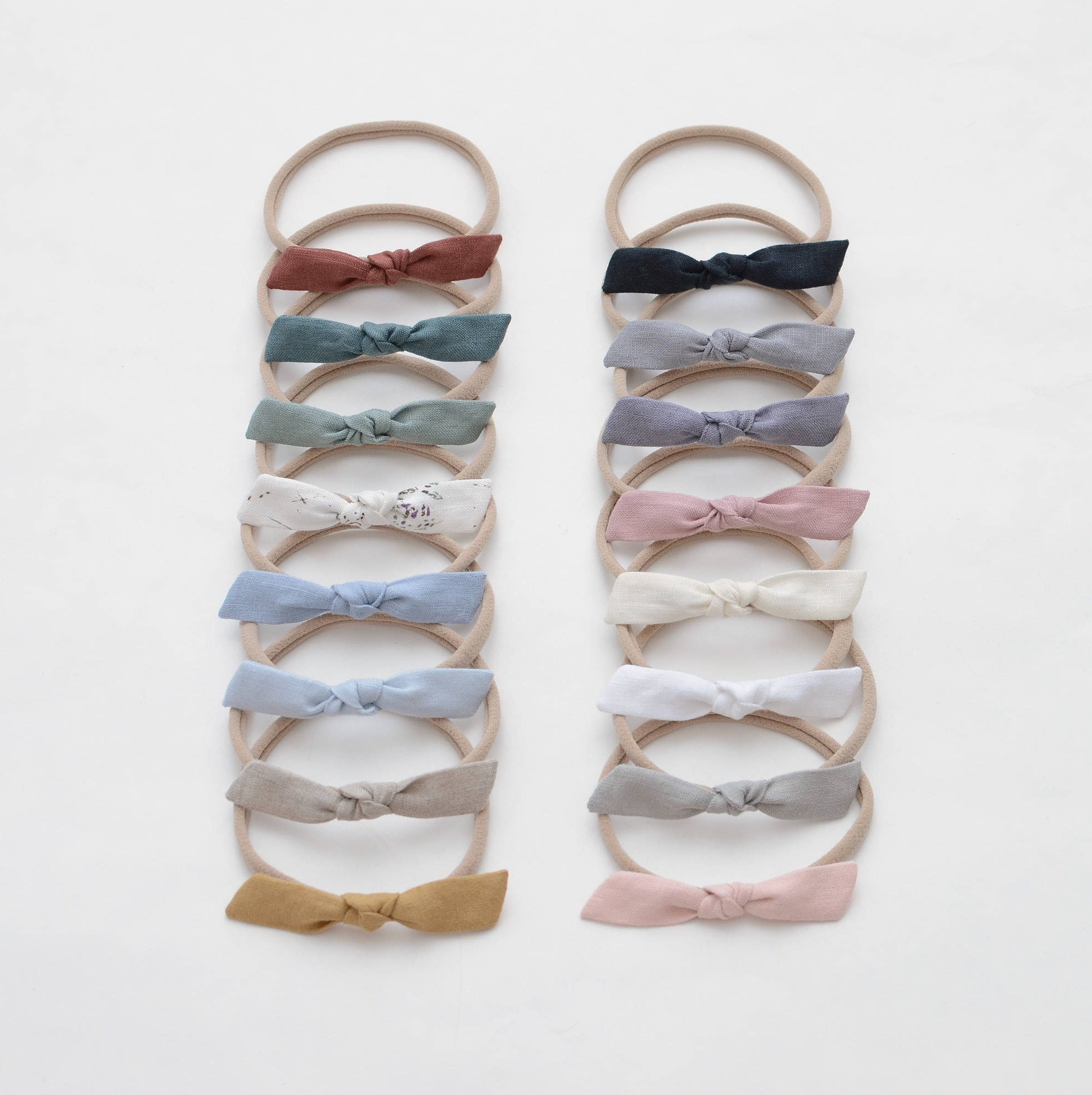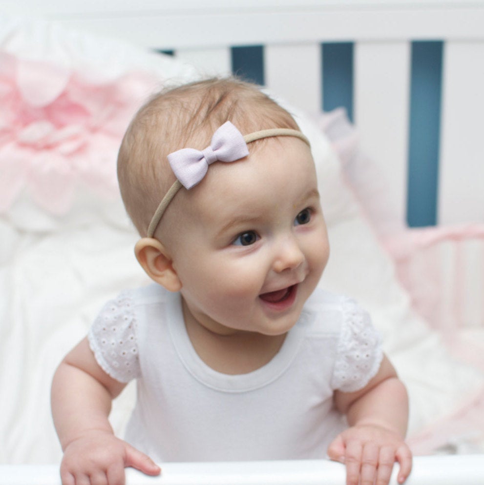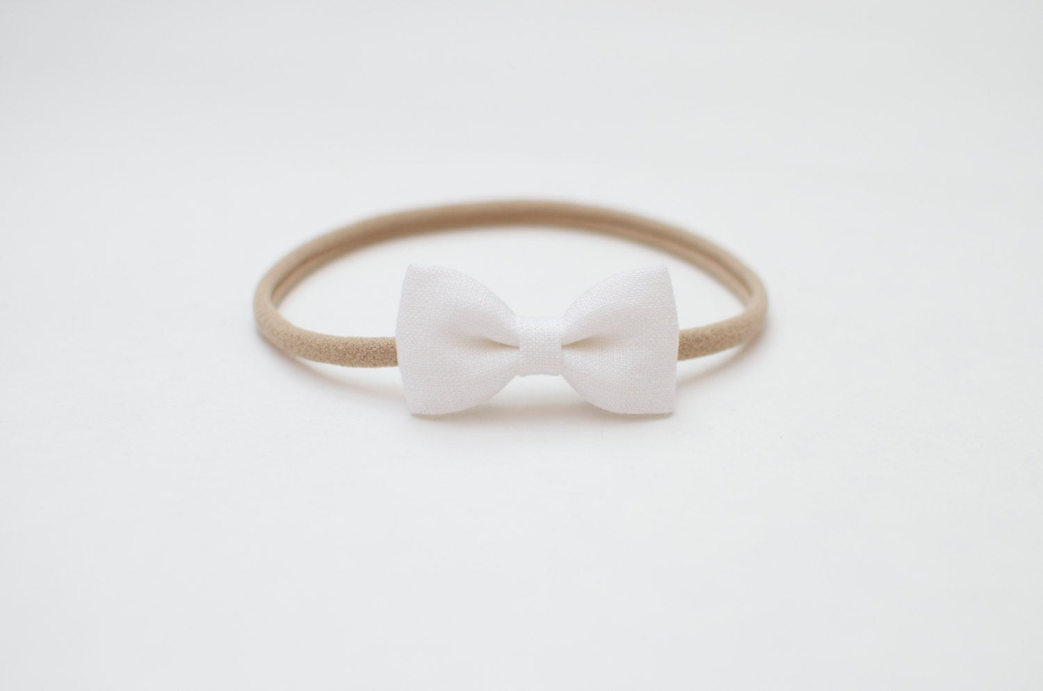 Natural color Organic linen small bow. Made from organic linen fabric. Bows are machine sewn and hand sewn using a minuscule amount of glue. On really soft elastic nude headband (one size will grow with your baby) or alligator clip 3rd picture. Available colors (4th picture).