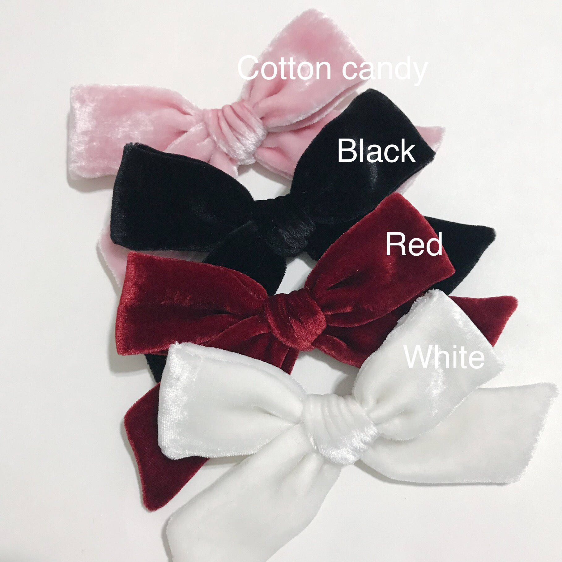 Made of Luxe velvet fabric(soft/best quality velvet) and attached to a regular alligator clip (right or left side "choose your side"). Oversized bow size 5''. 3rd picture included for a size of the bow.