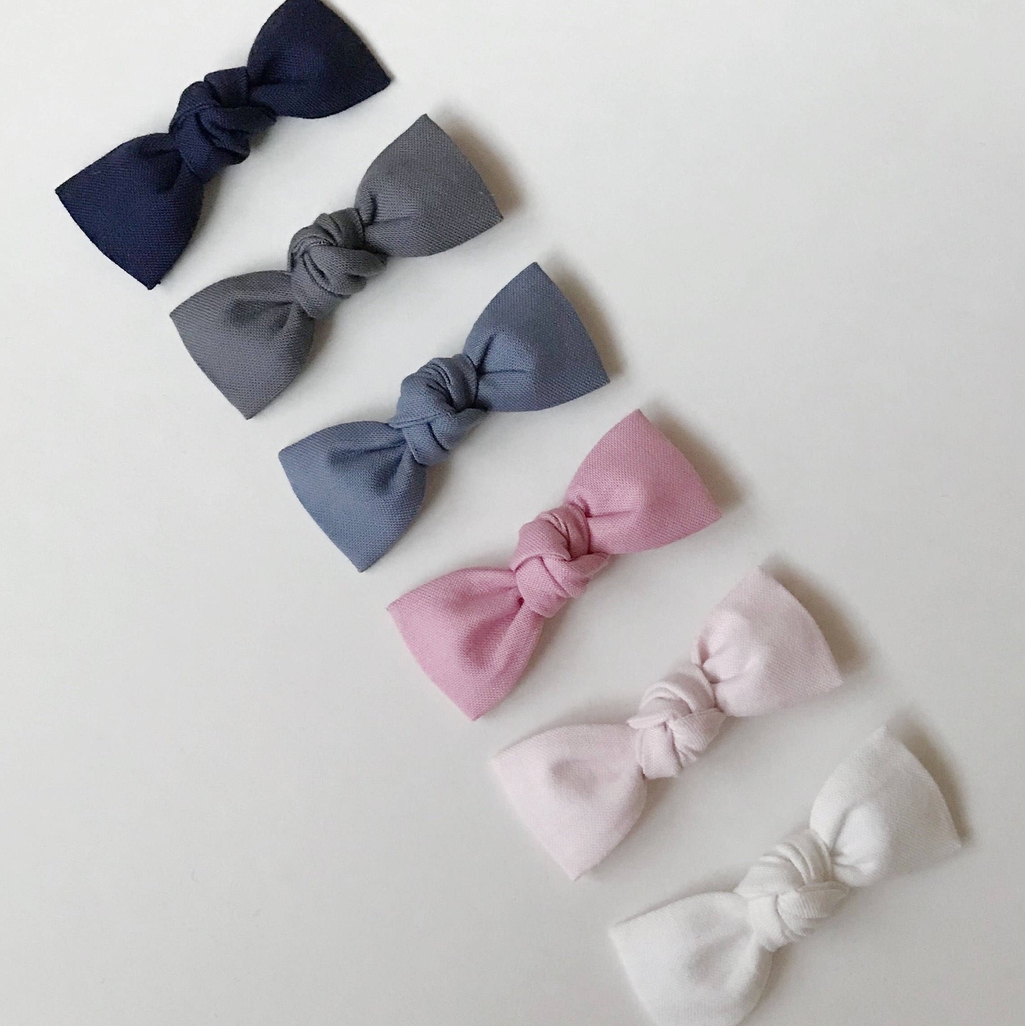 Machine sewn bows made of cotton fabric. Choose any two colours or two same (second color option make in a note). Small bows are hand tied (secured) and are on really soft nude elastic headbands or alligator clip. Headbands- one size fits most and will grow with your baby. Bows size approximately 3''. 3rd and 4th pictures included for the scale of bows.
